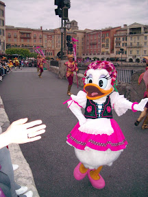 好不容易到了下午四點半,一天只有兩場的表演開始了,迪士尼的各種人物都跑出來慶祝春天百花盛開。在園區中央的海港也會開進一艘氣球做成的船,接著米奇和米妮也坐著船出現,最後則是小美人魚和阿拉丁乘著船出場做為壓軸。