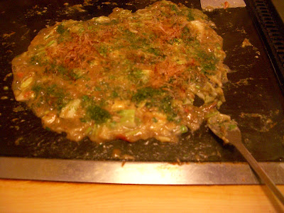 在台灣從沒吃過文字燒,只在料理東西軍裡看過的我,一直對這項美食很有興趣。文字燒的材料和做法我就不多介紹了,有興趣可以自己上網搜尋。我們點了章魚口味和牛筋口味的文字燒各一個,另外還應服務生推薦再點了一個櫻花蝦炒麵。